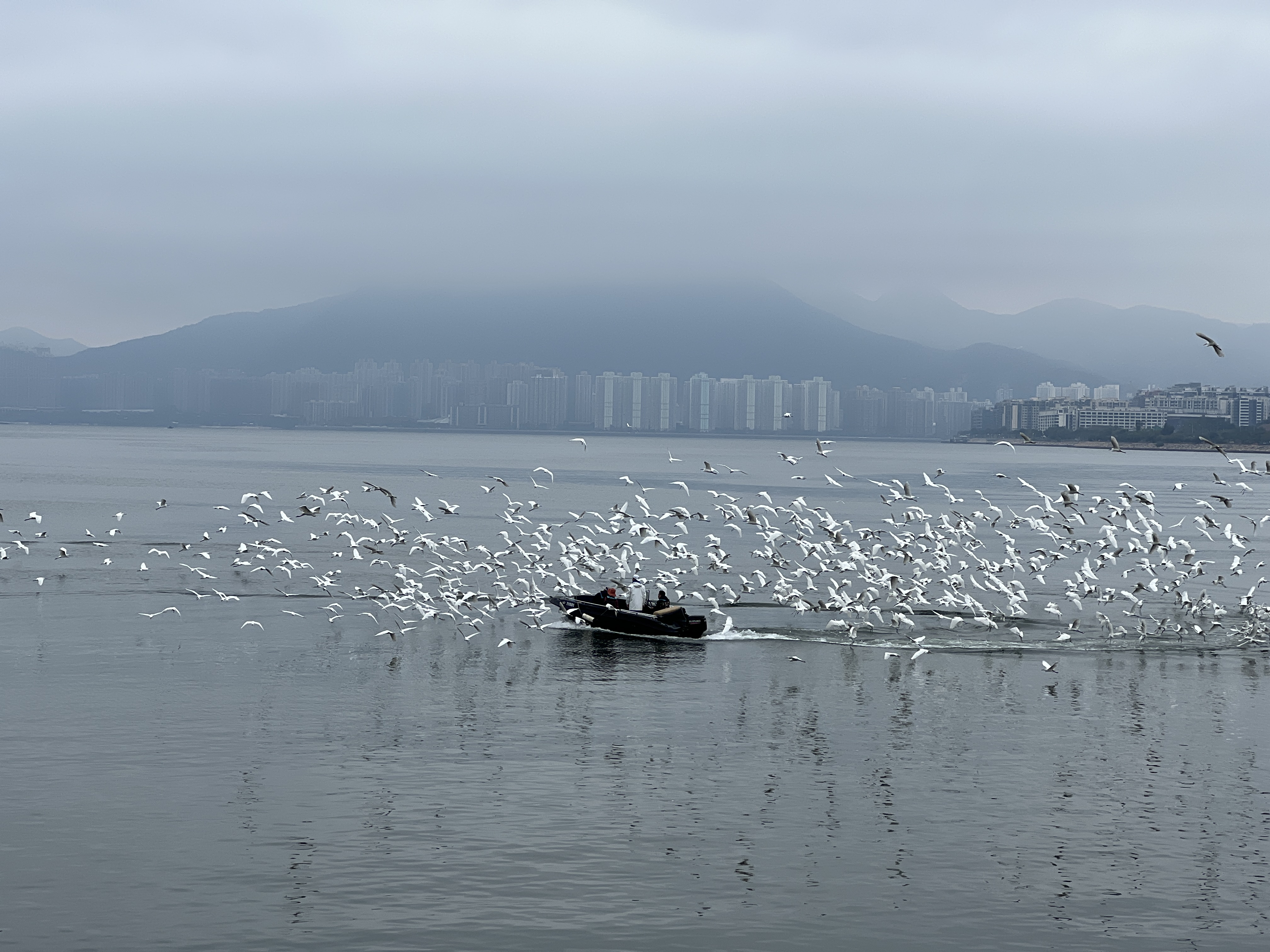 海鸟的视频源于2024.01.28和组里的同门和师兄在大围骑行途中看到的,一艘小船在海湾边游动边投食,海鸟一阵阵地绕着小船盘旋。